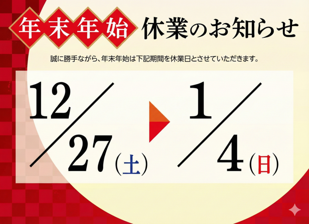 2025~2026年 年末年始休業のお知らせ当社では、下記の期間を年末年始休業とさせていただきます。 年末年始休業期間2025年12月27日(土)~ 2026年1月4日(日) 2025年12月26日(金)17:30…
